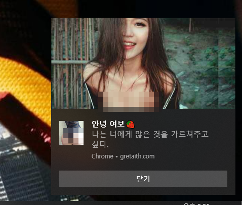 최근 뭘 잘못 눌렀는지 화면 오른쪽 하단에 구글 크롬으로 연결되는 여러 알림형 팝업 광고가 계속 나오고 있습니다. 오늘은 gretaith.com 이라는 사이트에 연결되는 이상한 이미지의 광고가 팝업되었습니다.