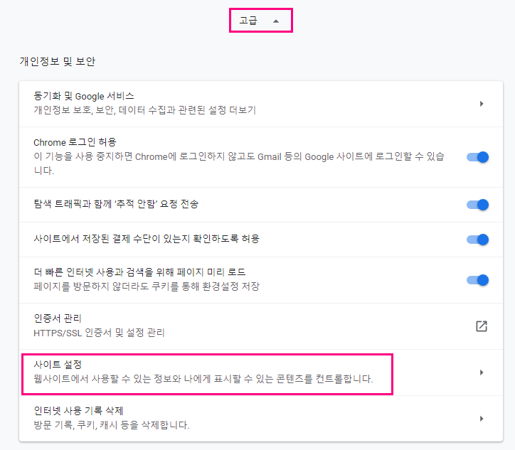 2. 아래쪽으로 스크롤 하여 [고급] > [사이트 설정] 메뉴로 이동합니다.