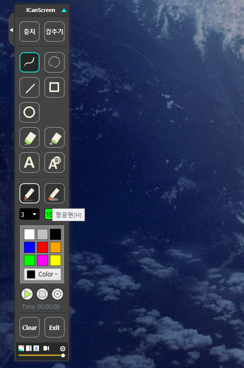 화면 판서용 선, 원, 사각형 등도 있고, 펜, 형광펜, 글자 쓰기 등도 지원을 한다. 단축키 지원도 해서 편하게 사용할 수 있고, 화면 판서한 내용을 녹화도 할 수 있다.
