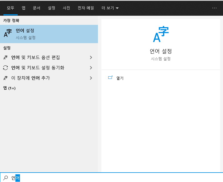 먼저 시작키 > '언어' 라고 입력을 하면 '언어 설정' 메뉴가 검색 됩니다. (윈도우 10 이상 기준) 만약 윈도우7 등 이하 OS를 사용하시는 제어판 > 시스템 설정 메뉴에서 찾아보시면 됩니다.