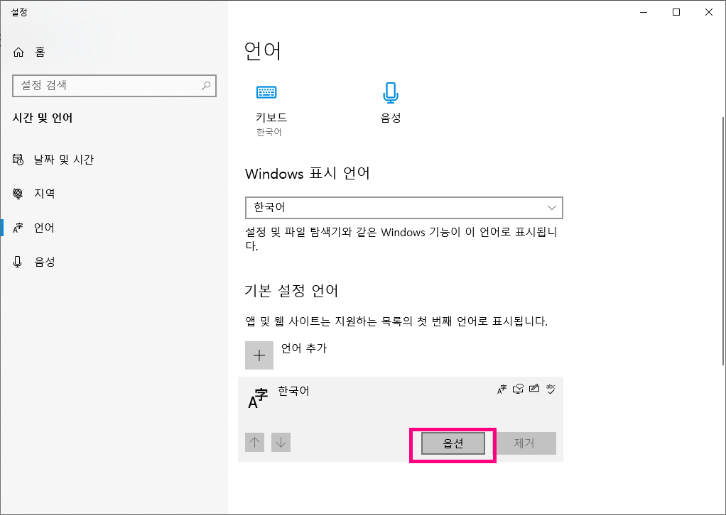 언어 설정 기능 실행하고, 아래쪽으로 스크롤을 내리면 '기본 설정 언어 > 한국어'가 있는데, 클릭하면 위 이미지처럼 '옵션' 버튼이 활성화되어있습니다.