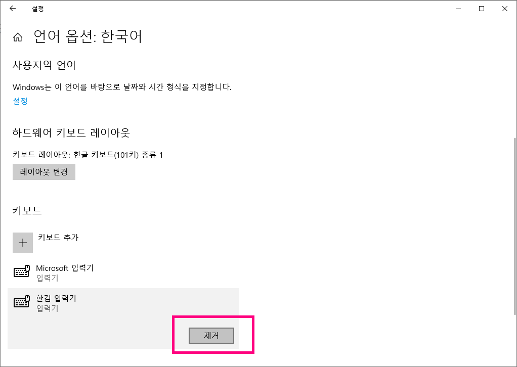 '언어 옵션: 한국어' 화면으로 이동한 뒤, 스크롤을 아래로 내리면 키보드 영역에 Microsoft 입력기와 한컴 입력기 메뉴가 보입니다. 클릭하면 위 이미지처럼 제거 버튼이 활성화 되는데, 바로 버튼을 클릭해주면 됩니다.