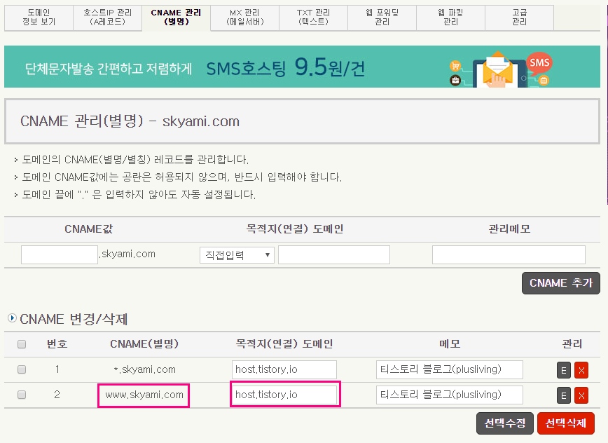 만약 도메인 앞에 blog 등을 붙여 blog.도메인 형태를 사용하는 분이라면 www가 아닌 blog를 입력하면 됩니다.