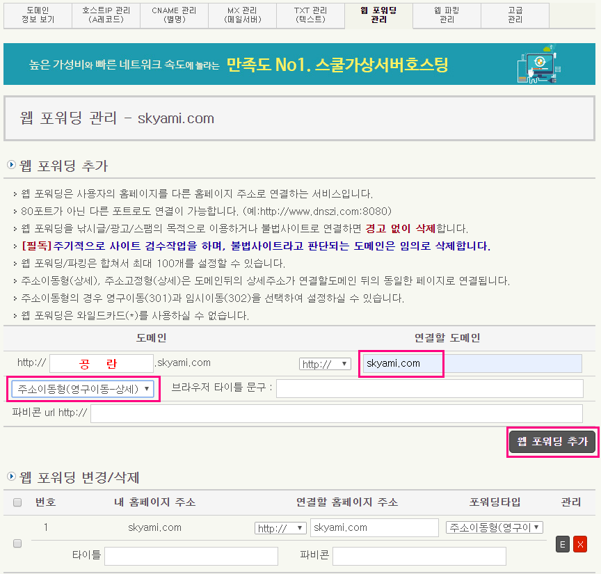 웹 포워딩 추가 버튼을 클릭하면 아래 목록에 추가 되고, 도메인 연결할 티스토리 블로그 설정 화면에서 도메인을 연결해주면 간단히 해결 됩니다.