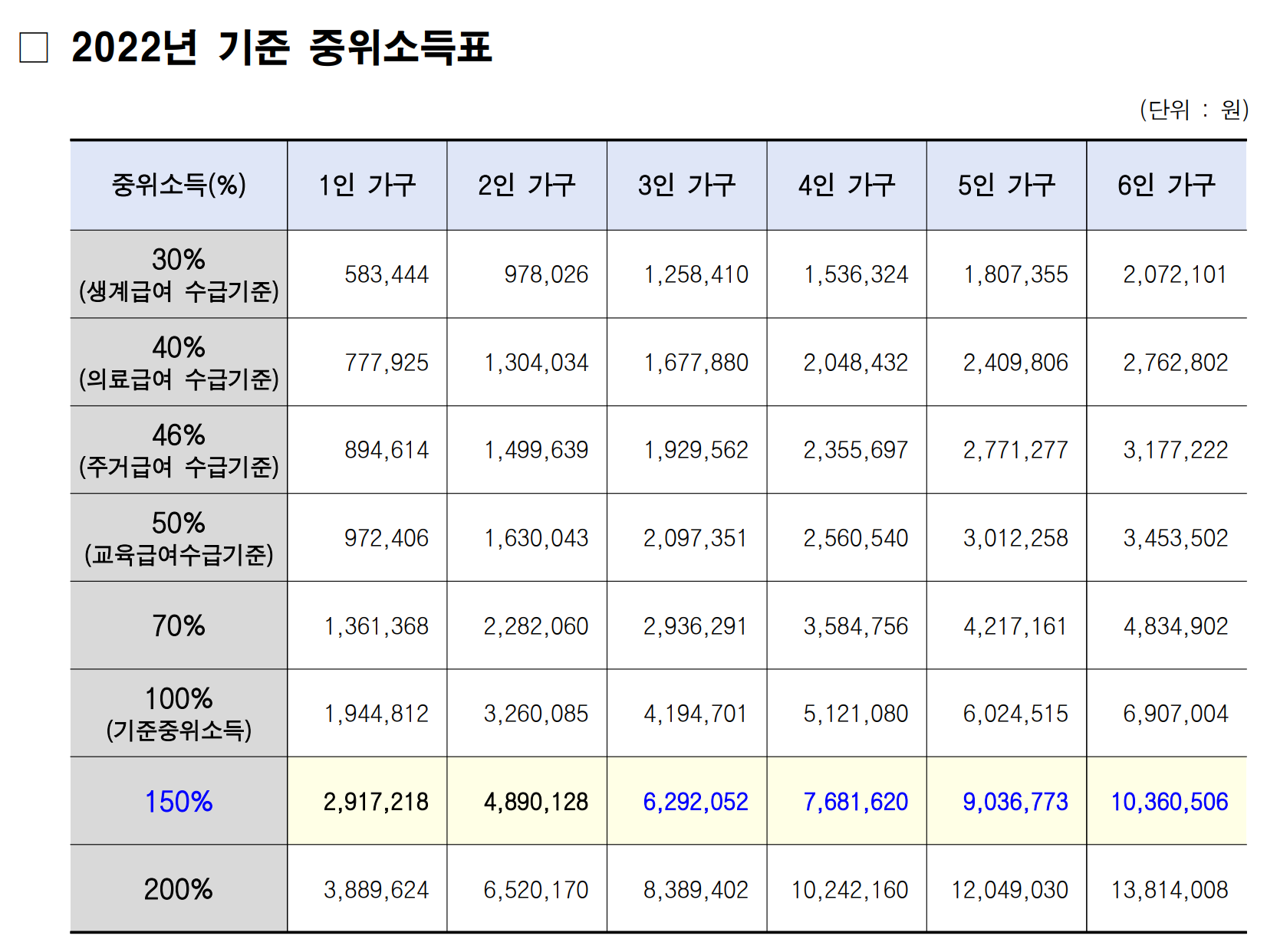상세 내용은 앞으로 간단히 정리해서 알려드릴 에정인데, 오늘은 가사서비스와 안심돌봄 지원에 필요한 '기준 중위 소득표' 정보(2022년 기준)을 간단히 정리해드리겠습니다.