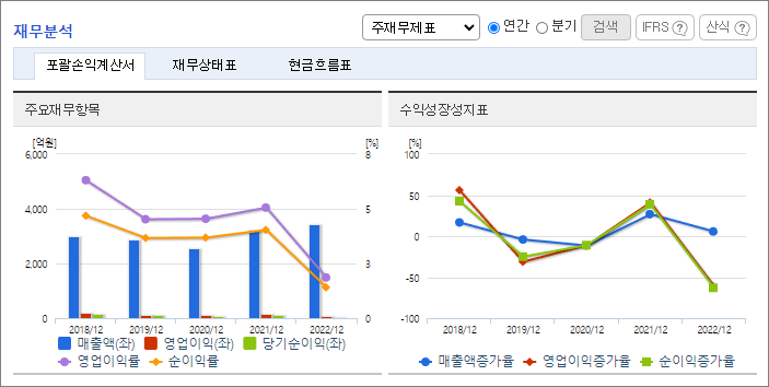 2022년 연결기준 매출액은 3,421.75억원으로 전년대비 5.64% 증가했으며, 영업이익은 63.56억원으로 전년대비 61.18% 감소했습니다. 순이익은 48.25억원으로 전년대비 63.06% 감소했습니다.