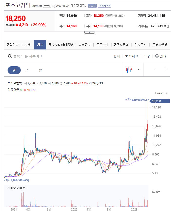 최근 2차전지 테마와 포스코케미칼 관련 재료가 움직이며 포스코엠텍이 지속 상승 중이었는데, 오늘 드디어 상장 후 최고가를 돌파했습니다. 의미 있는 날이네요.