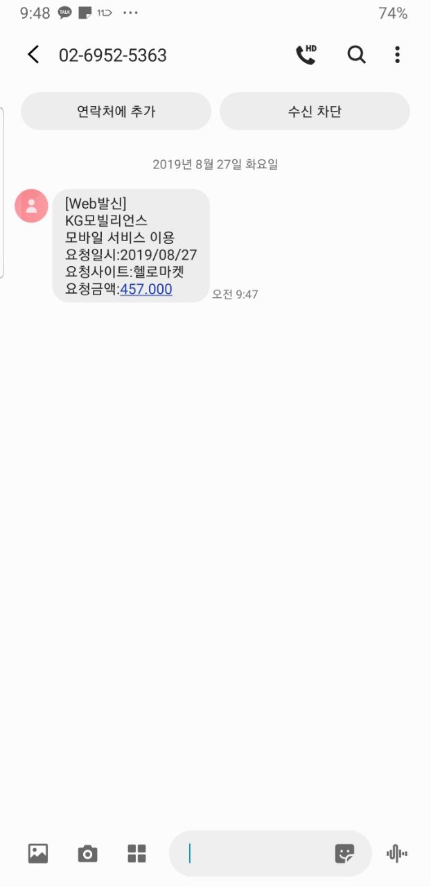방금 아래와 같이 02-6952-5363 번호로 KG모빌리언스 모바일 서비스 이용 문자가 왔습니다. 오늘 날짜로 헬로마켓을 통해 457.000 (달러라는건지 원이라는건지..) 결제가 요청 된 것 같은 문자였는데요.