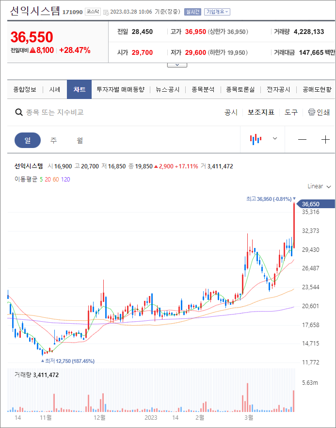 ▲ 선익시스템, 23년 3월 28일 10시 6분 기준 차트