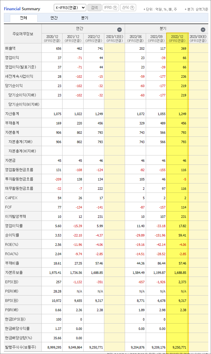 선익시스템 2022년 4분기 실적은 매출액 369억원, 영업이익 66억원, 당기순이익 219억원으로 지난 분기 대비 실적이 큰 폭으로 개선되는 모습을 보여주고 있습니다. 재무적으로도 건정성이 높아지고 있는 것으로 보이네요.