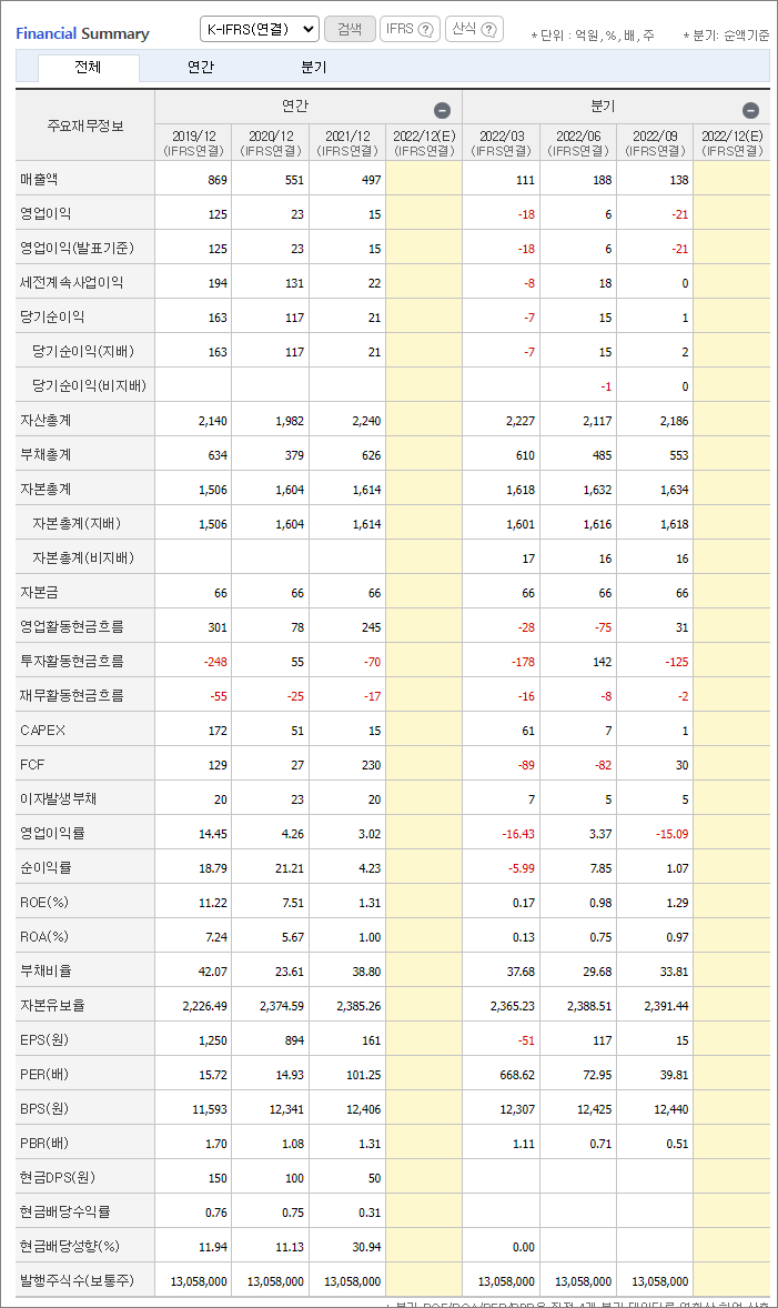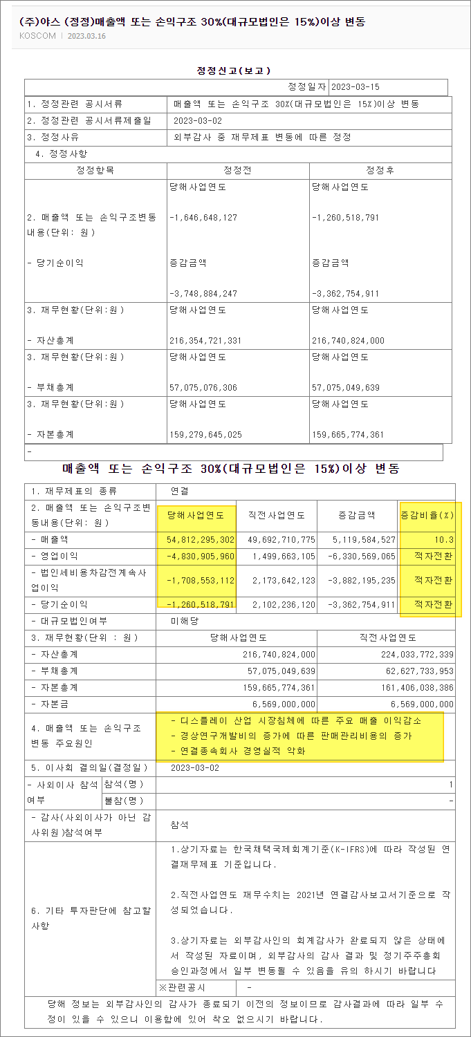 아직 22년 사업보고서 제출 전이라 4분기 실적이 미반영 상태입니다. 디스플레이 업종이 계속 안좋다보니, 야스 실적도 계속 안좋은 상황인데, 최근 발표한 잠정실적을 보면..