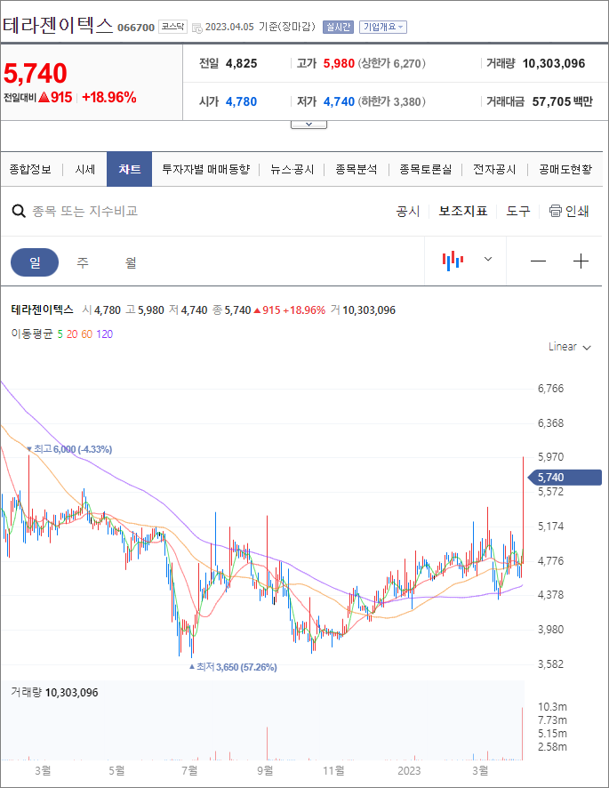 테라젠이텍스는 작년 롯데헬스케어 관련 뉴스가 나온 뒤, 차트를 만들다가 오늘 상승 추세로 턴 하는 모습을 보여주고 있습니다. 앞으로 시세가 기대됩니다.