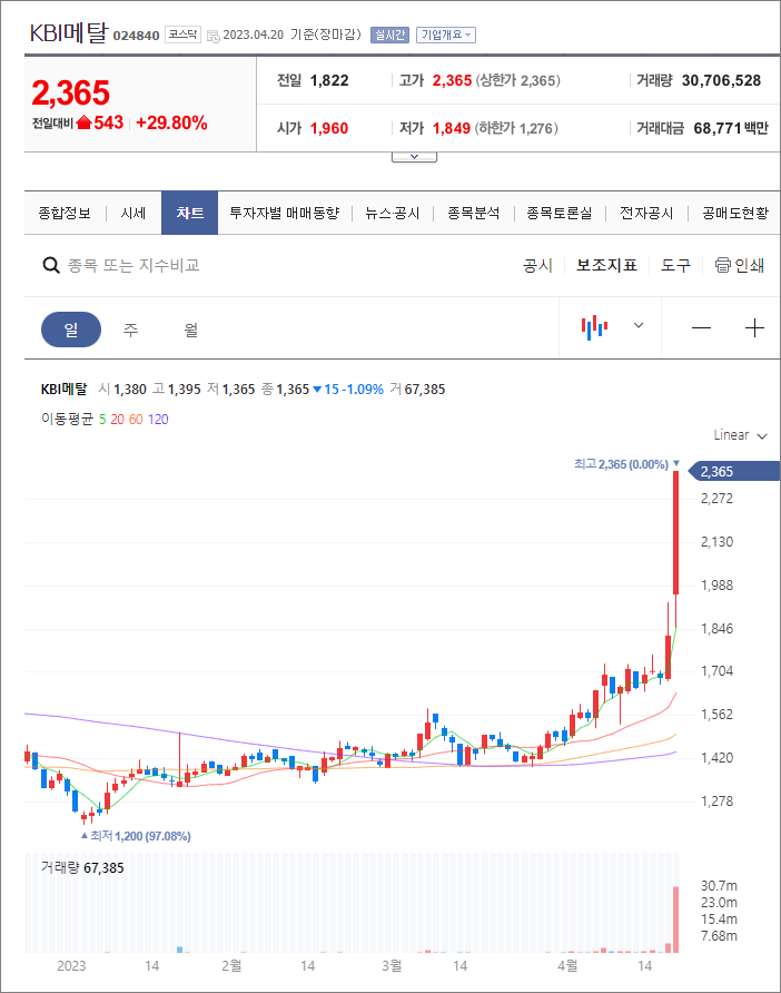 KBI메탈은 오늘 약 687억원의 거래대금이 들어오면서 상한가로 마감되었습니다. 최근 전력설비(전선) 테마쪽에 상승세에 편승해서 힘을 받게 된건데, 단기적으로 관심 가져볼 만 합니다.