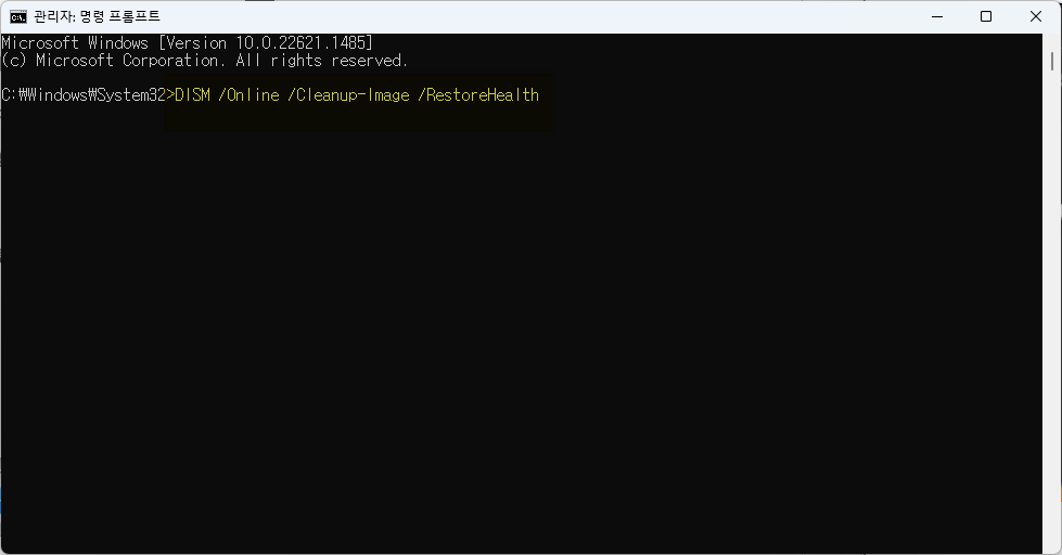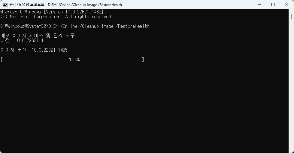 위 이미지처럼 복구 작업이 진행되는데, 100% 가 완료되면 다음 명령어를 입력해 시스템 파일 검사를 실행해줍니다.