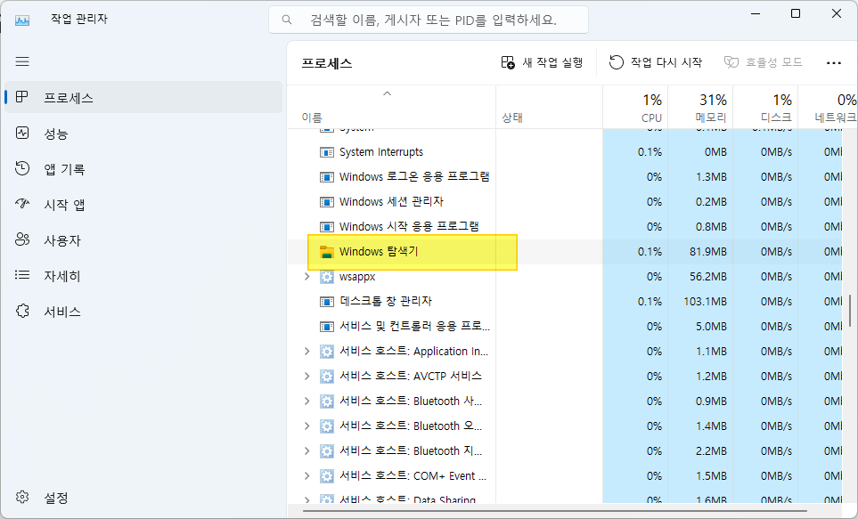 프로세스 탭에서 'Windows 탐색기' 를 찾습니다.