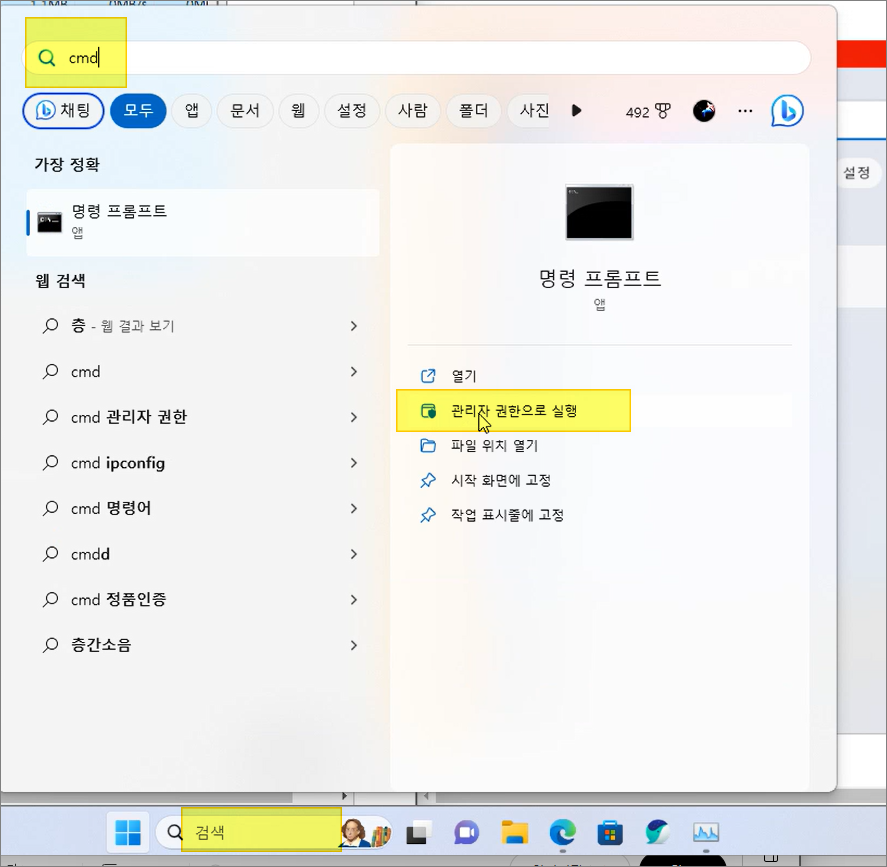 [시작] ▶ cmd 를 입력해 [명령 프롬프트]를 실행해줍니다. 윈도우 11 등 '검색' 입력란을 사용하시는 분들은 거기서 그냥 cmd 입력하시면 됩니다. 참고할 점은 [명령 프롬프트] 를 그냥 실행하는 것이 아니라 '관리자 권한으로 실행'으로 상위 권한을 받은 상태로 실행해야 합니다.