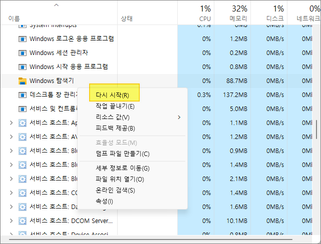 'Windows 탐색기' 에 마우스 우클릭 한 뒤, [다시 시작] 메뉴를 실행해줍니다. 그러면 윈도우가 재부팅 되는 것처럼 순간적으로 모든 창이 사라지고 화면이 새로고침됩니다.
