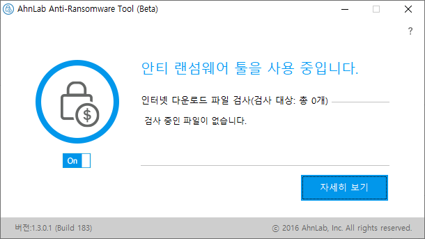 설치가 완료되면 위와 같은 프로그램이 설치되며 ON 상태를 유지하면 항시 랜섬웨어 검사와 방지하는 동작을 수행하고 있습니다. 사용자가 별도로 신경써줄 것은 없습니다.