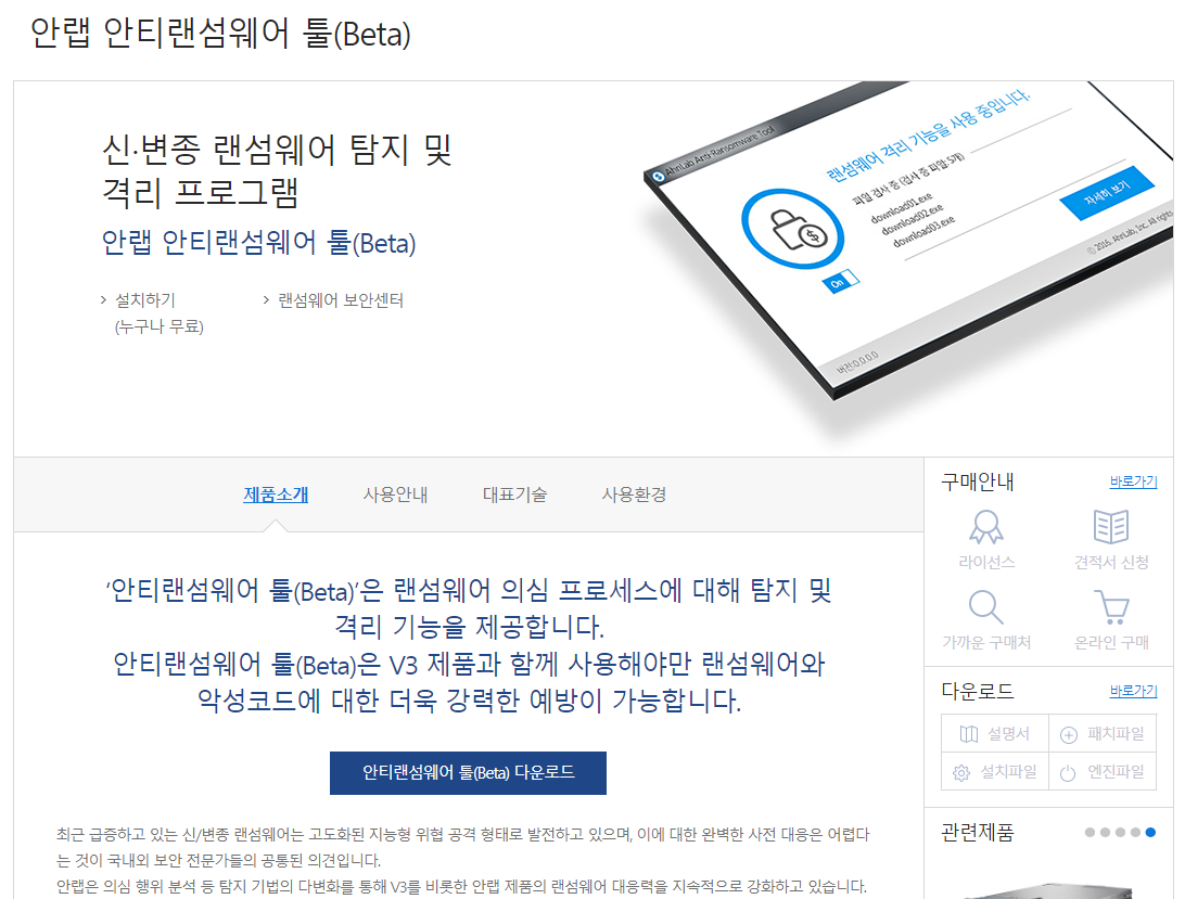 먼저 안랩 안티랜섬웨어 툴(Beta) 을 다운로드 할 수 있는 공식 페이지로 이동 합니다. [바로가기]