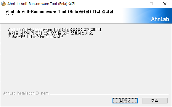 간단하게 다음> 다음> 을 눌러 설치해주면 되고, 랜섬웨어 검사하는 프로그램 외에 추가로 설치하는 것은 없습니다.