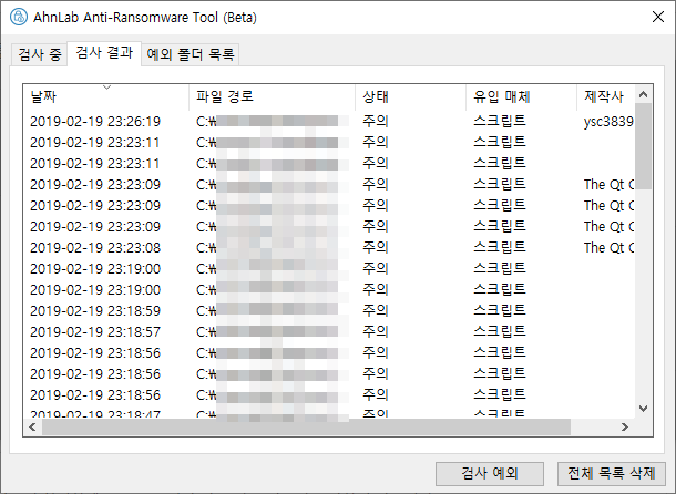 자세히 보기를 눌러보면 검사 중인 경우, 검사 중 탭에서 리스트가 나오고, 랜섬웨어 검사를 해야 하는 경우(다운로드 등)실행 완료되면 검사 결과 탭에서 리스트를 볼 수 있습니다. 특정 폴더에서는 랜섬웨어 검사를 진행하지 않았으면 좋겠다고 하시는 분들은 예외 폴더 목록에서 추가하시면 됩니다.