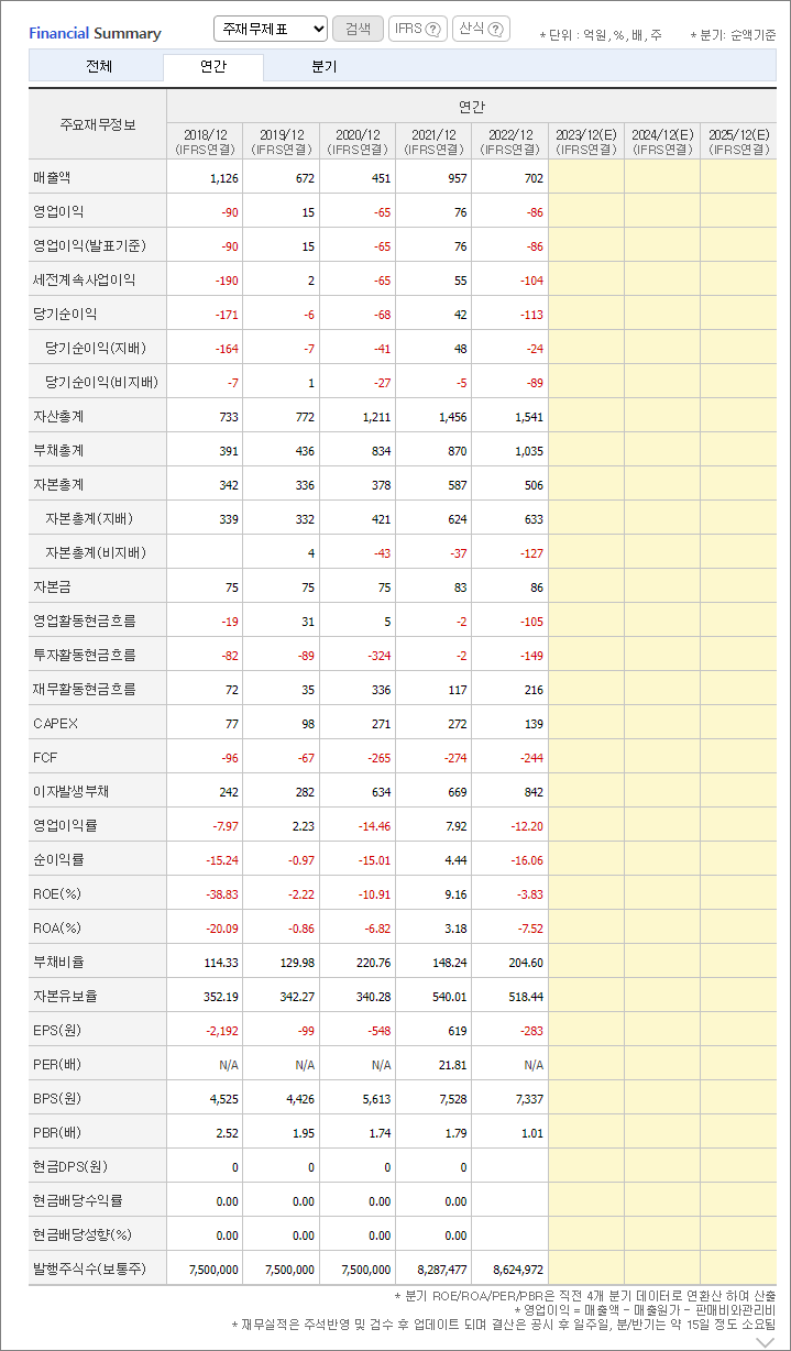 EG의 최근 실적을 보면 매출액, 영업이익, 당기순이익 모두 하락 추세인 것을 확인할 수 있습니다. 영업이익과 순이익이 적자전환된 것은 아쉬운 점이네요. 재무적으로도 영업 활동으로 현금 창출을 못하고 있고, 부채가 늘어나는 구조입니다. EG는 당장 망할 기업은 아니지만, 실적 성장에 호재가 많진 않은 것 같네요.