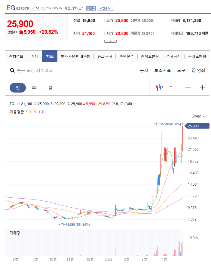 EG는 상한가로 마감되었습니다. 중요한 가격대를 모두 돌파한 신고가라 단기적으로 추가 상승을 기대해볼 수 있겠습니다. 25,800원, 28,200원이 중요한 가격이 되겠네요. 계속 모니터링 필요합니다.