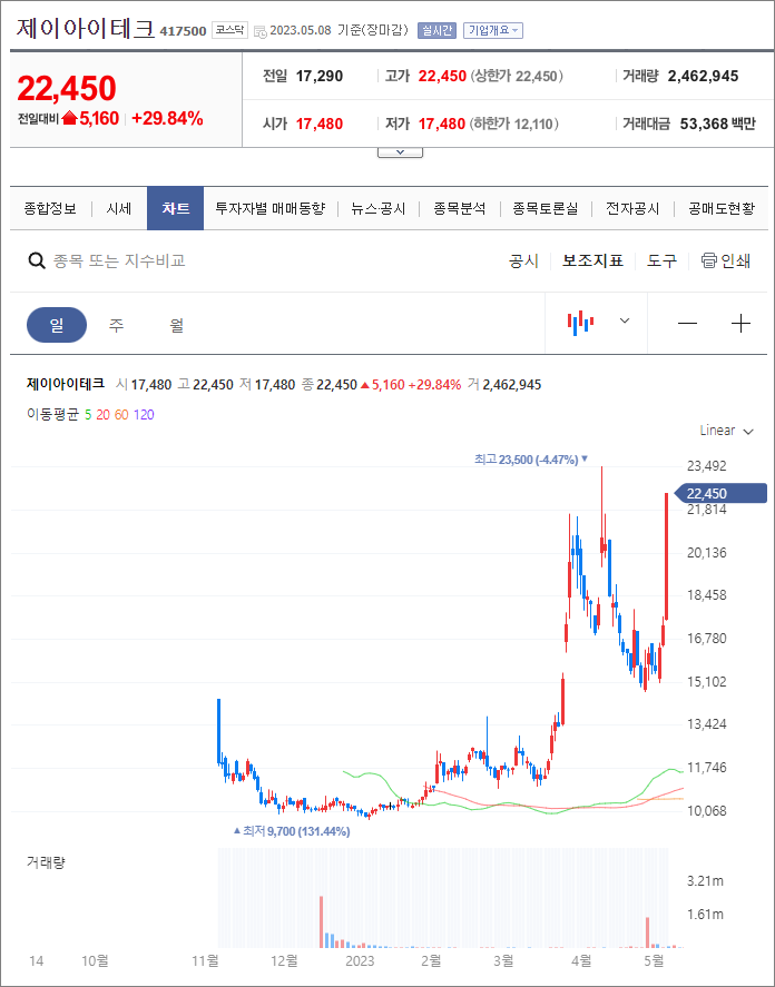 제이아이테크 주가는 상한가 마감되면서 상장 후 최고가를 다시 돌파 시도하는 흐름을 보여주고 있습니다. 크게 물려 있는 물량이 없는 듯 하여 추가 상승에 어려움은 많이 없는 상황입니다.