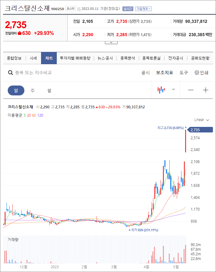 크리스탈신소재 주가는 3월 이후부터 중국주에 대한 기대감이 커지면서 4월에 강한 시세를 줬고, 적절한 가격, 기간 조정을 거친 뒤, 그래핀 재료가 나오면서 연일 상한가입니다. 2,765원을 돌파하고 지지해야 안갔던 길을 갈 수있는데, 어찌될지 단기간 지켜볼 만 할 것 같네요.