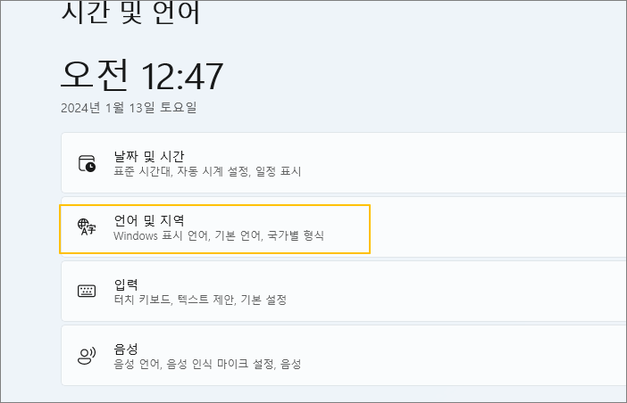1. [설정] > [언어 및 지역] 메뉴로 이동합니다.
