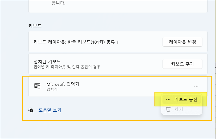4. 아래쪽으로 스크롤하면 [키보드] > [Microsoft 입력기]가 있고, 점 세개 메뉴 > [키보드 옵션] 실행합니다.