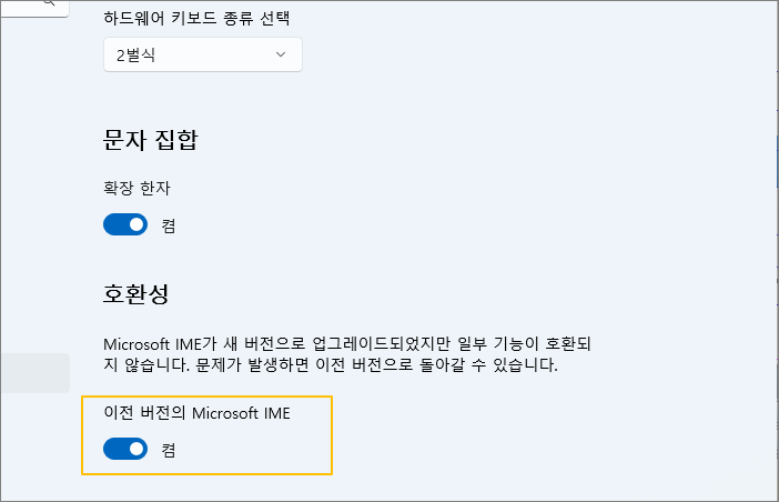 5. 여러 옵션이 있는데, 젤 아래쪽에 '이전 버전의 Microsoft IME' 를 '활성화' '켬' 상태로 바꿔주면 기본 설정이 완료됩니다.