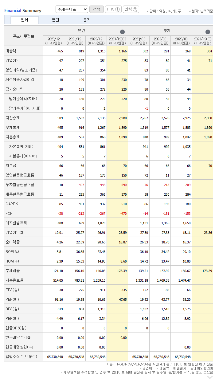 매출액, 영업이익, 당기순이익 모두 상승 추세가 주춤하고 있습니다. 하지만 내년 이후 실적 흐름은 다시 좋아질 것으로 예상되네요. 레이크머티리얼즈는 영업 활동으로 현금 창출을 잘 하고 있고, 공장 등 투자 활동도 이어가고 있는데, 부채를 늘려가는 흐름은 아쉽긴 합니다.