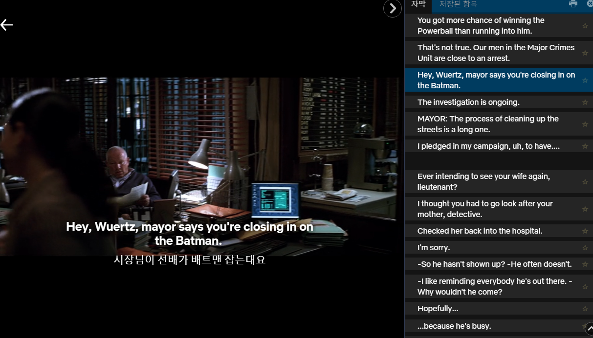 평소와 다르게 오른쪽에 자막이 나오고 현재 재생되는 영상의 위치에 맞는 대사가 하이라이트 됩니다. 근데 이렇게 보기만 하면 조금 부족할 수 있죠?