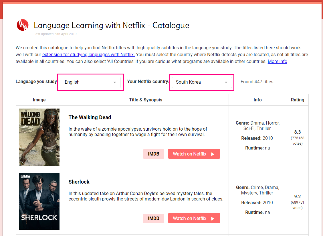 Language Learning with Netflix - Catalogue Last updated: 9th April 2019 We created this catalogue to help you find Netflix titles with high-quality subtitles in the language you study. The titles listed here should work well with our extension for studying